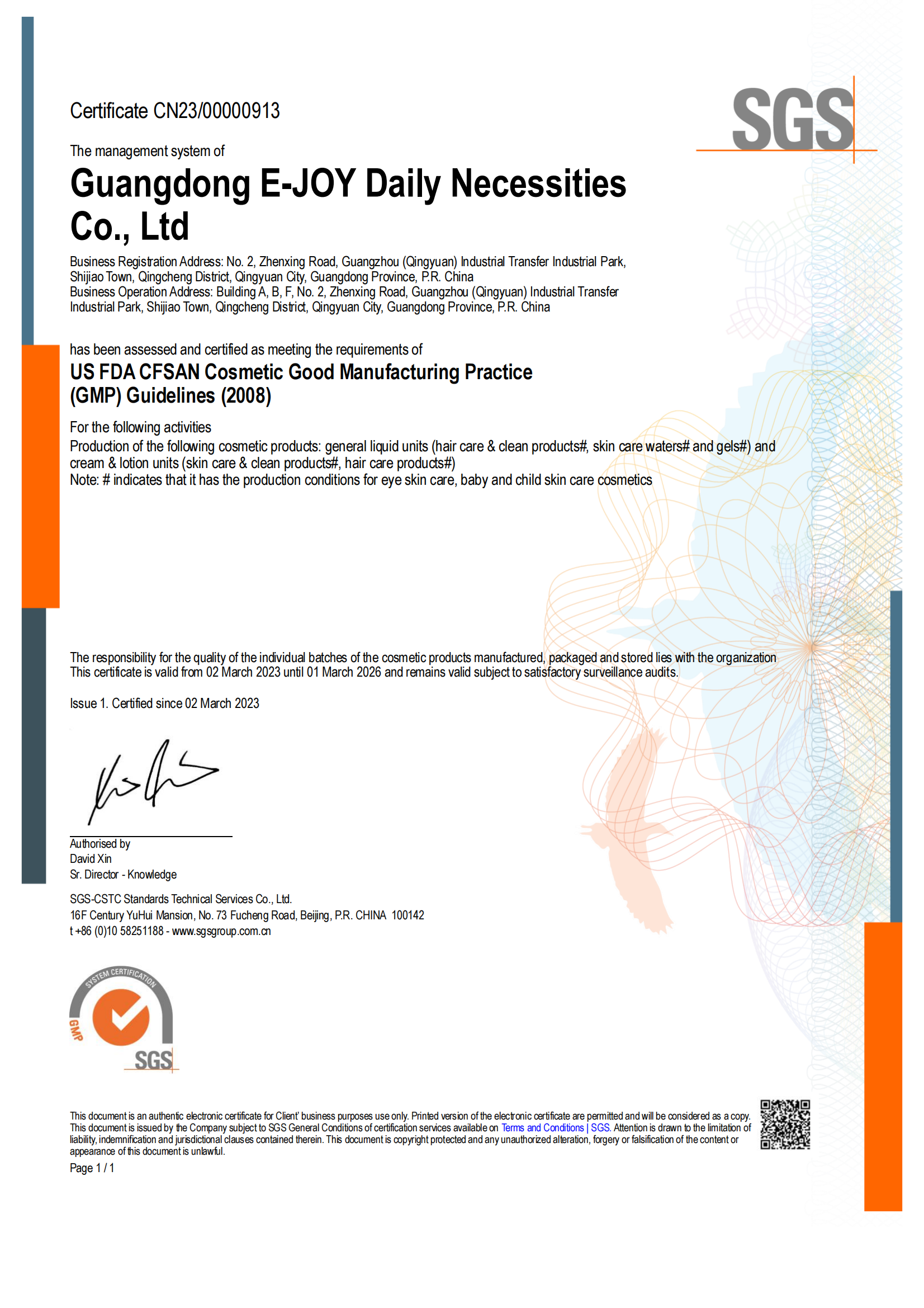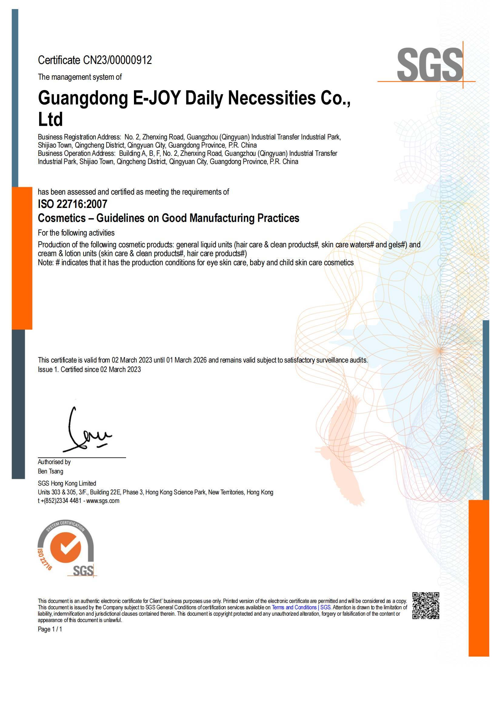 Factory status: E-JOY covers an area of 80,000 square meters, and has a GMPC 100,000-level dust-free production workshop, ISO9001, ISO22716, GMPC cosmetics good production practices and other certificates, and a number of patent certificates.